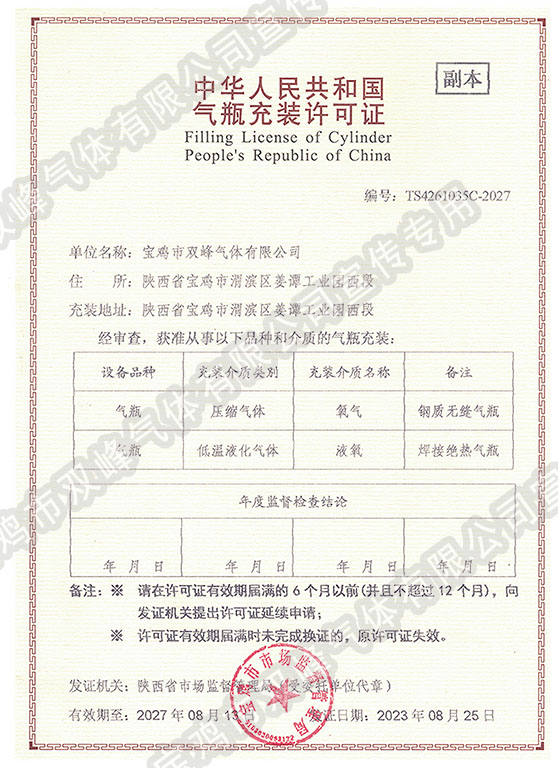 寶雞市雙峰氣體有限公司主營(yíng):標(biāo)準(zhǔn)氣體、工業(yè)氣體、醫(yī)用氣體、軍用氣體、特種氣體、氣體工程、氣瓶檢驗(yàn)、醫(yī)療器械產(chǎn)品的研發(fā)與銷(xiāo)售、?;返缆愤\(yùn)輸服務(wù)、電子商務(wù)等。公司全資或控股子公司:陜西雙峰氣體科學(xué)研究院有限公司,陜西西咸新區(qū)百花氣體有限公司,陜西愛(ài)心氧療科技有限公司,陜西鳳之翔網(wǎng)絡(luò)科技有限公司,寶雞市光明氣體有限公司。